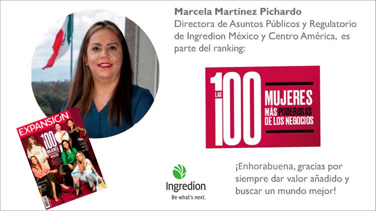 “En la Compañía creemos en el valor compartido y el compromiso de cerrar la brecha de género. Sabemos que esto se logra con liderazgo, con un cambio de cultura, que se propone desde nuestra estrategia de negocio y de sustentabilidad. Todo esto es posible gracias a la excelencia de nuestros colaboradores. Enhorabuena Marcela, por este reconocimiento y por el agregar valor y excelencia a todas tus acciones”, expresó Luz del Carmen Nájera. VP Global de Asuntos de Gobierno en Ingredion Incorporated.