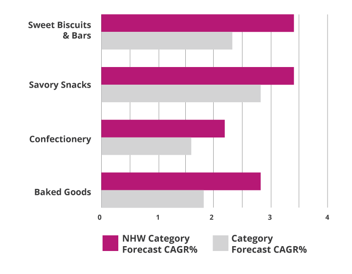 Se espera que los aperitivos centrados en la nutrición, la salud y el bienestar aumenten a un ritmo más rápido que los aperitivos tradicionales (CAGR% 2021-26)3